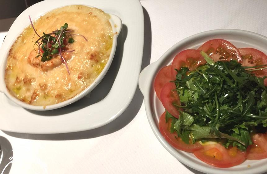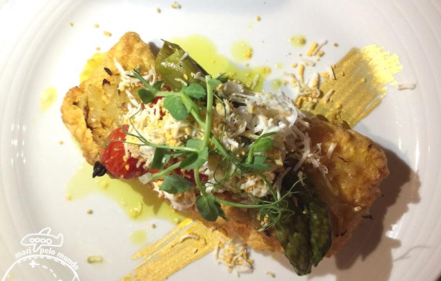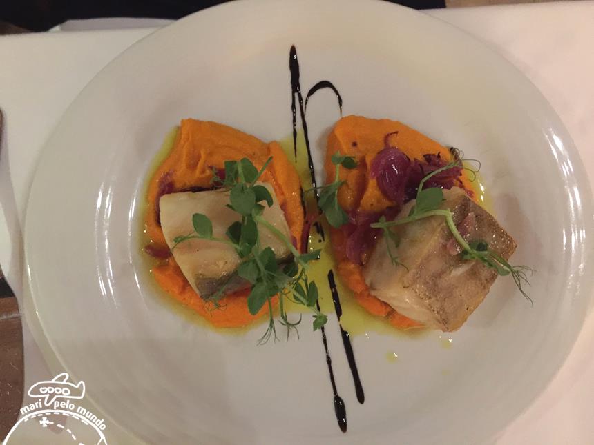 Tem as lascas fritas com queijo e tomate que é espetacular, a posta assada com um creme agridoce super delicioso.
