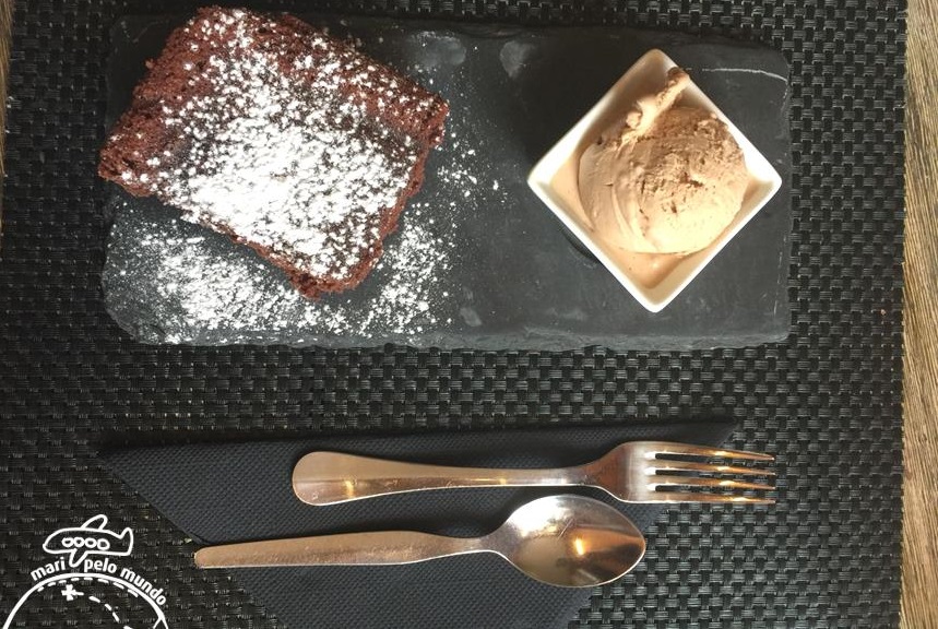 As sobremesas curtam em torno de 4 euros e há sorbet do dia. Nas fotos, o Crumble de maçã com sorbet e o bolo de chocolate com sorbet.