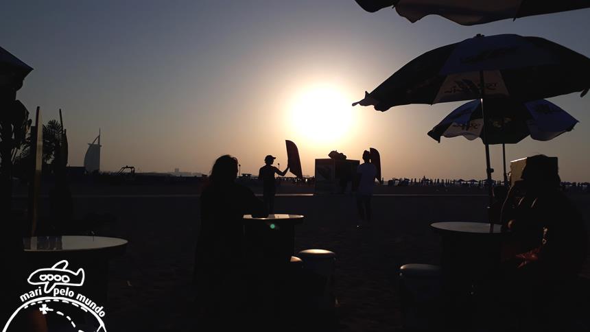 Isso tudo, com o icônico Burj Al Arab ao fundo e as ondinhas da praia fazendo barulho. Ondinhas… o mar é calmo e é por isso que a Kite Beach é ótima para esportes aquáticos.Se puder ficar até o por do sol, não vai se arrepender. O pôr do sol em Dubai é um espetáculo a parte e deve ser admirado da praia, do barco, do Burj Khalifa… de onde for possível.