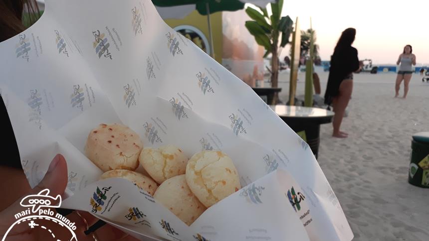 Tem caldo de cana e pão de queijo. O café é servido com brigadeiro. As mesinhas são pé na areia e a música é brasileira.