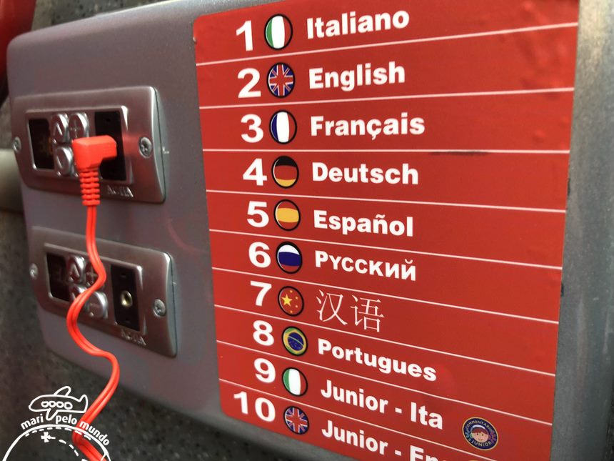 Os ônibus possuem um sistema de áudio individual com comentários sobre os lugares por ondem passam. Você recebe um fone de ouvido na sua primeira entrada que pode ser conectado no seu assento. Os comentários estão disponíveis em português. É uma ótima forma de entregar as crianças por exemplo.