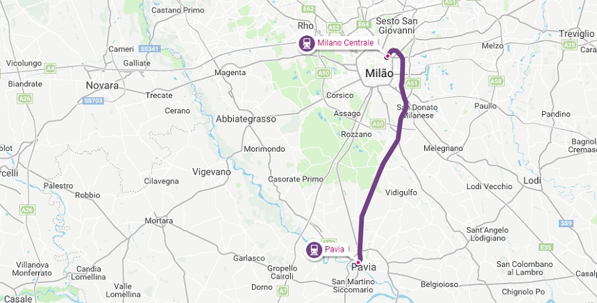 De Milão para Pavia há trens (trenitalia) saindo da Estação Central, Garibaldi ou o SE que faz a linha Porta Venezia/Dateo até Pavia. A frequência é grande (meia em meia hora ou uma em uma hora) principalmente nos horários da manhã e final de tarde. O trajeto leva 25 minutos.