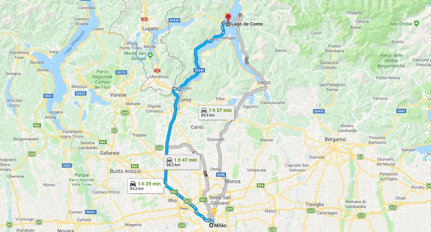 Não chega a 90 Km de distancia de carro. O trajeto pode levar de uma hora a duas. A paisagem é bonita e a estrada é boa. Uma opção que vale a pena e você pode escolher os trajetos para fazer pequenas paradas. Lecco é lindo e tem post aqui também .