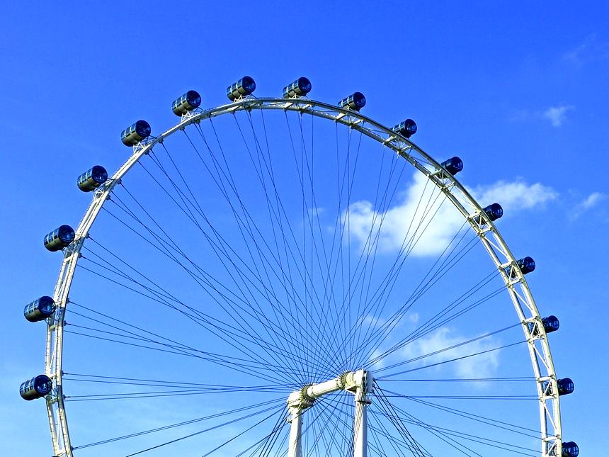 Singapore Flyer é a maior roda gigante do mundo. Cabem 28 pessoas em cada cabine. A volta completa dura 30 minutos.