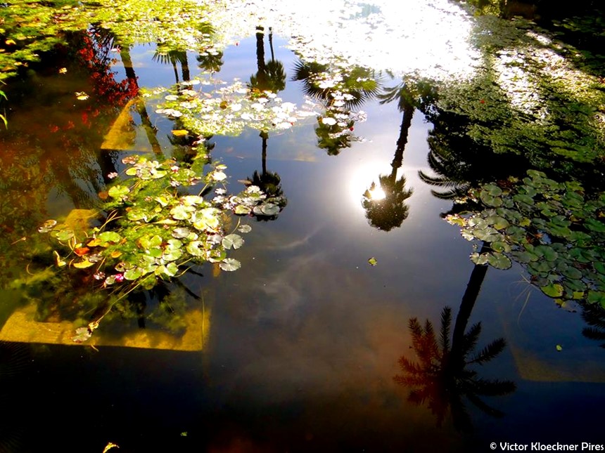O local é repleto de lírios d’água e lagoas de lótus e conta com um edifício de estilo mouro pintados de azul intenso.