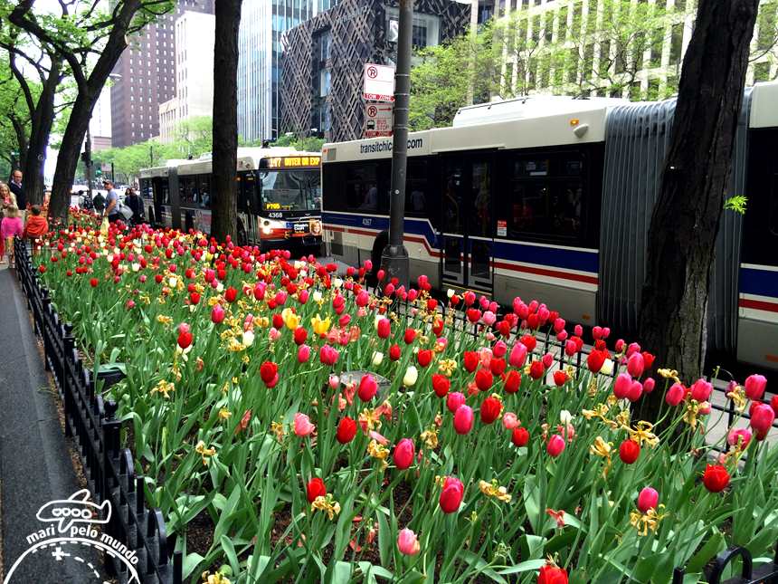 A primavera é alegre, florida, a cidade fica enfeitada, as pessoas caminham até tarde na rua. Mas um casaco corta vento é indispensável, e às vezes a temperatura pode cair para a casa do 10°C por alguns dias. Veja Michigan Avenue na primavera!