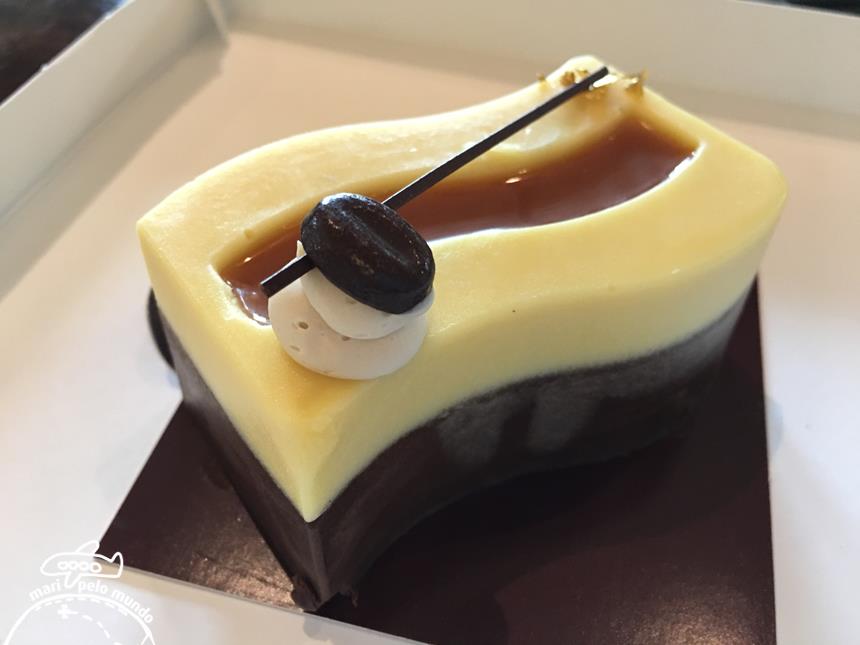 Nós provamos o Mickey Mouse. Bolo chiffon de chocolate, mousse de chocolate amargo e mousse de chocolate branco.
