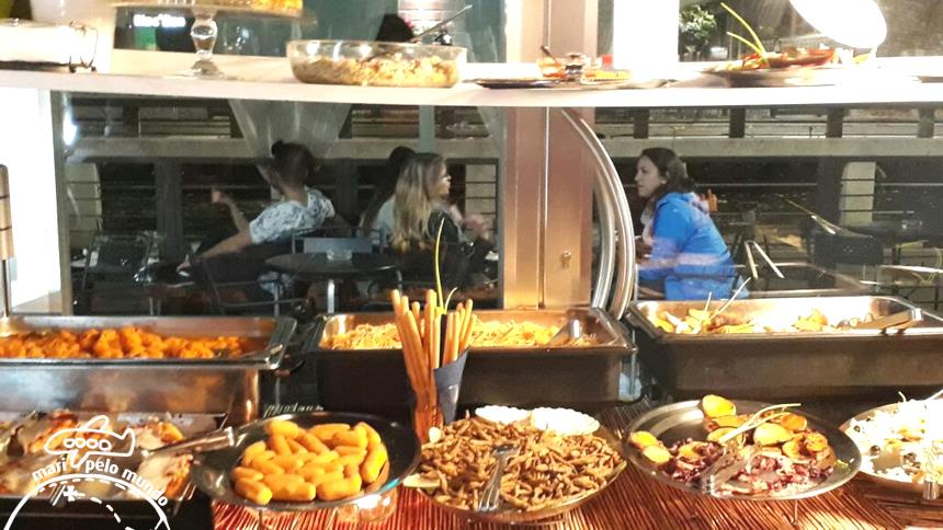 Diferente de alguns que possuem apenas pezinhos e frios. Este possui pratos quentes variados, massas, tortas, saladas, bolinhos e verduras.