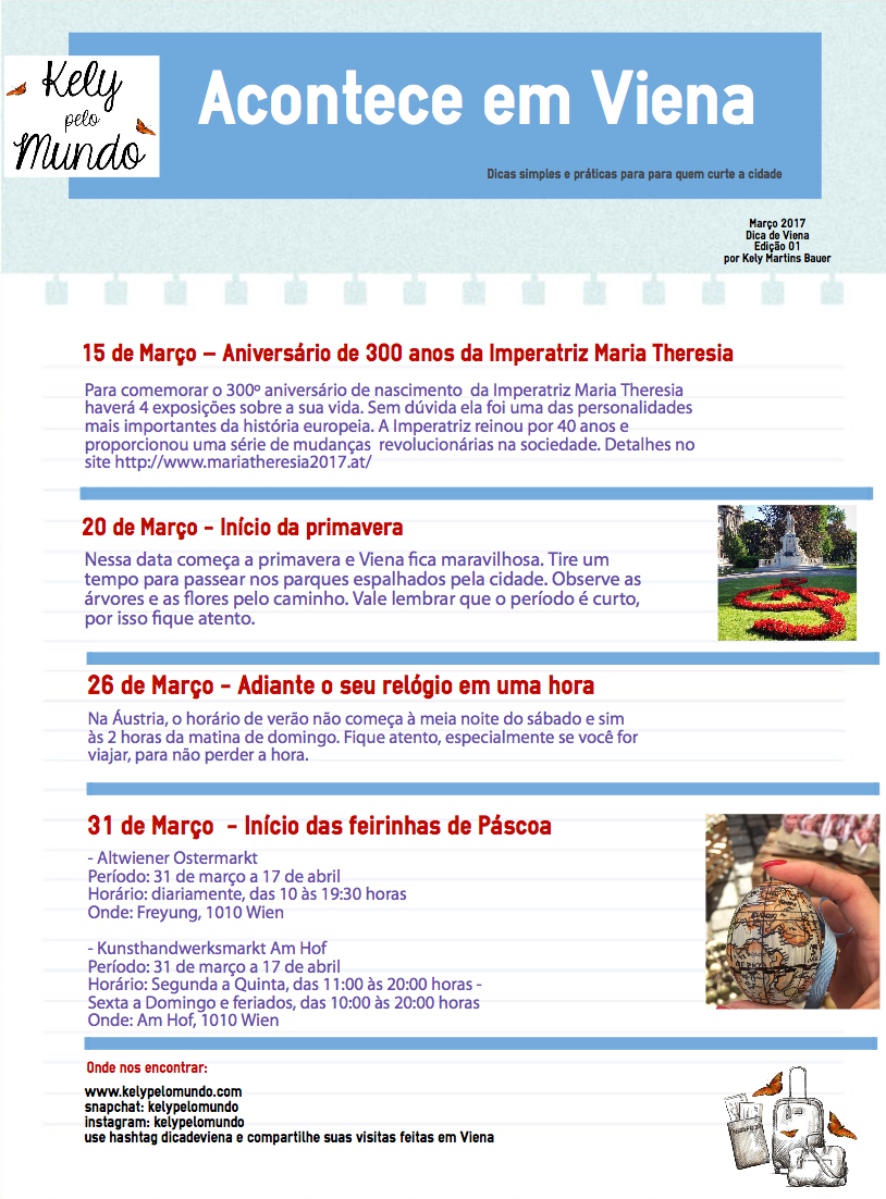 Para comemorar o 300º aniversário de nascimento da Imperatriz Maria Theresa haverá 4 exposições sobre a sua vida, pois foi uma das personalidades mais importantes da história europeia. A imperatriz reinou por 40 anos e proporcionou uma série de mudanças revolucionárias na sociedade. Detalhes no site http://www.mariatheresia2017.at