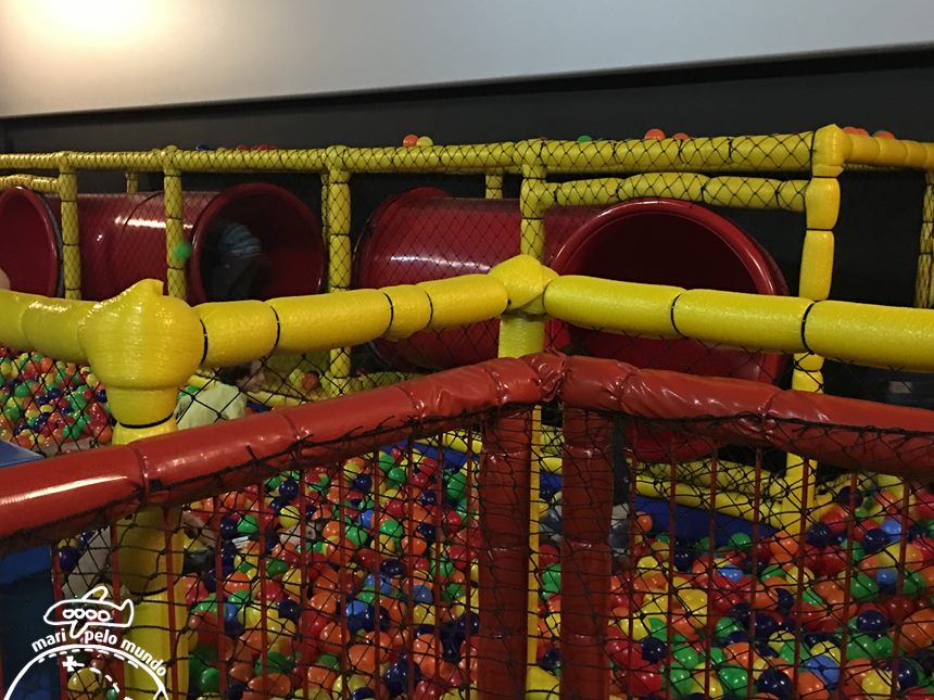 Na extensão toda da sala abaixo da tela, piscina de bolinhas e jogos para crianças. Com um espaço separado para os pequeninos até 5 anos, e outros para os maiores.