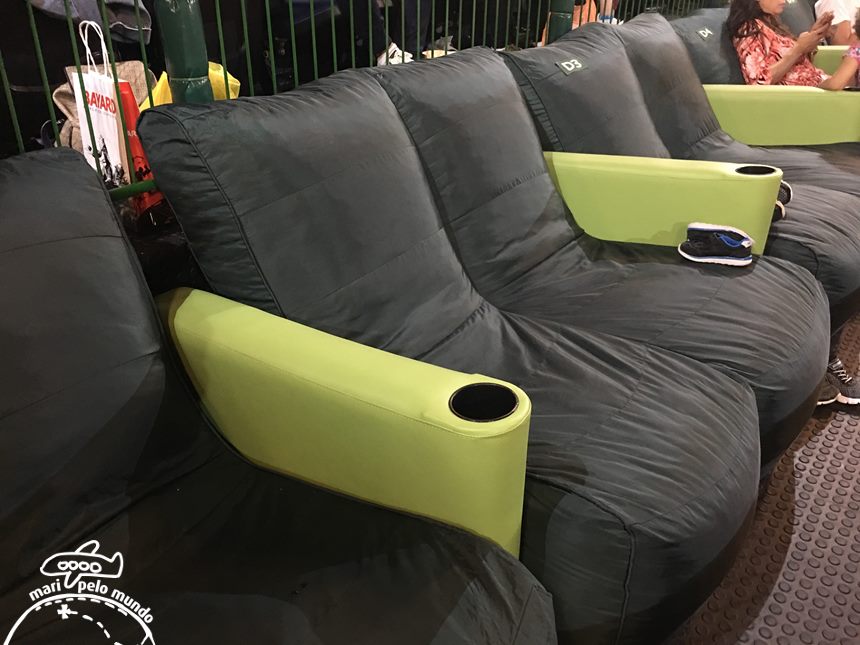 As poltronas também são especiais. O cinema tem uma área com poltronas padrão, na parte mais alta da sala. No meio são três fileiras de puffs. Confortáveis e espaçosos, são duas fileiras de puffs para duas pessoas e mais uma fileira com puffs individuais. E bem embaixo uma ultima fileira de cadeiras do tipo espreguiçadeiras.