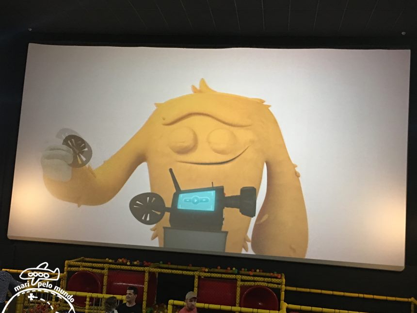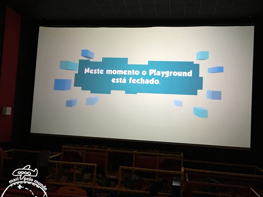 Durante 15 minutos antes de começar o filme as crianças podem brincar à vontade, basta tirar os sapatos antes. Quando o filme está para começar a mascote da sala aparece na tela chamando os pequenos para o filme. “Voltem para suas poltronas que o filme já vai começar!”