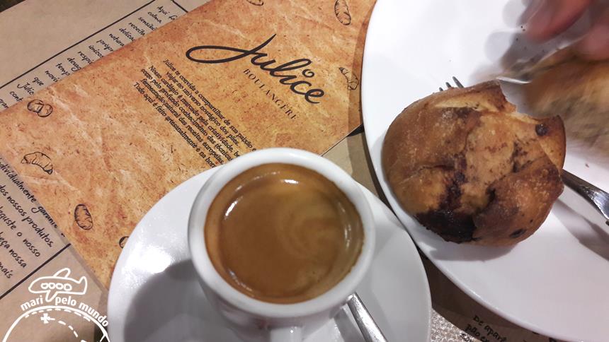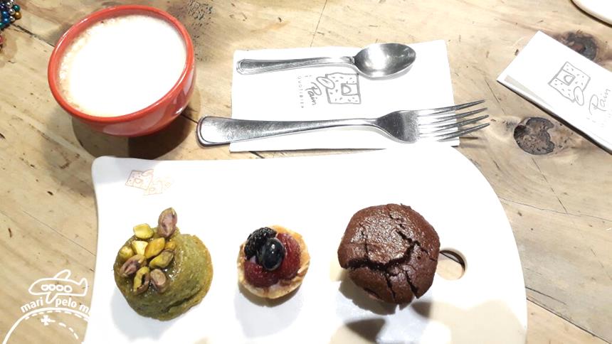 Café no bowl e docinhos gostosos em dois tamanhos. Escolhi os pequenos para poder provar todos.