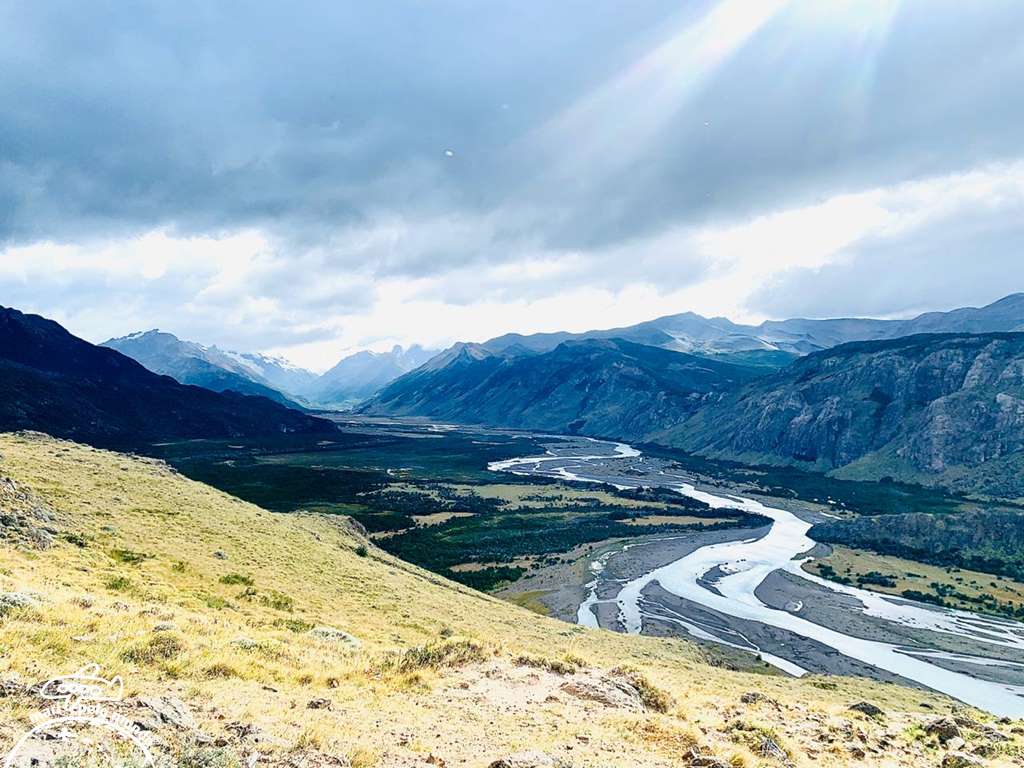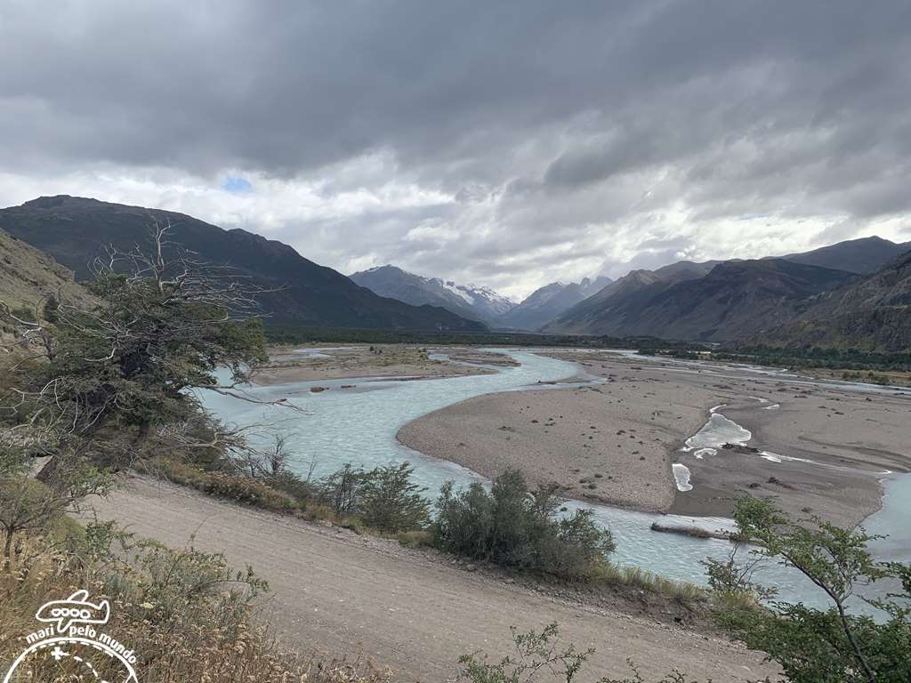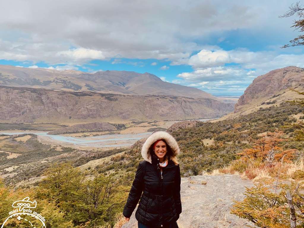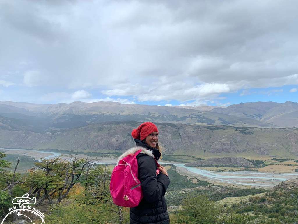 Na segunda opção, caminhei com a Ana até o mirante do Rio de las Vueltas. O vento é fortíssimo. Parecia que eu iria ser carregada. E meu celular quase voou! Mas a paisagem é impressionante!
