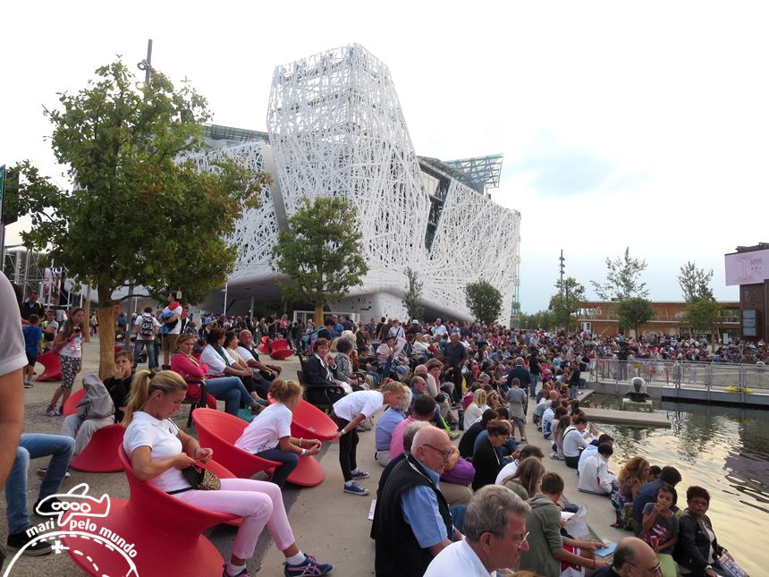 A Expo 2015 em particular lembra uma Disneylândia. Filas organizadas para entrar e um esquema todo preparado. O bilhete é um pouco caro, mas vale a pena. O corredor central muitíssimo amplo para a circulação de milhares de pessoas ao mesmo tempo é coberto. Há também um ônibus para levar o visitante de uma ponta a outra, mas o acesso é pela lateral e não pelo corredor central.