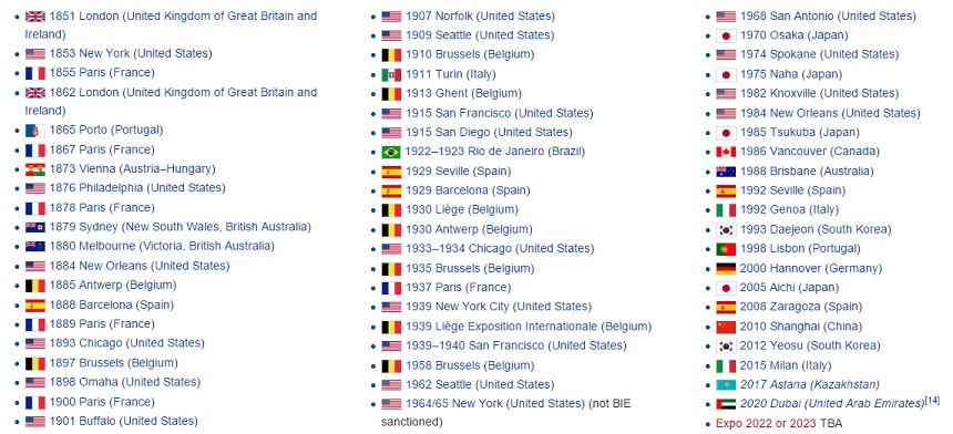 A primeira e mais famosa Expo foi a realizada no Palácio de Cristal, no Hyde Park, Londres em 1851, sob o título “Grande Exposição dos Trabalhos da Indústria de todas as Nações ” ideia do príncipe Albert, marido da rainha Victoria.