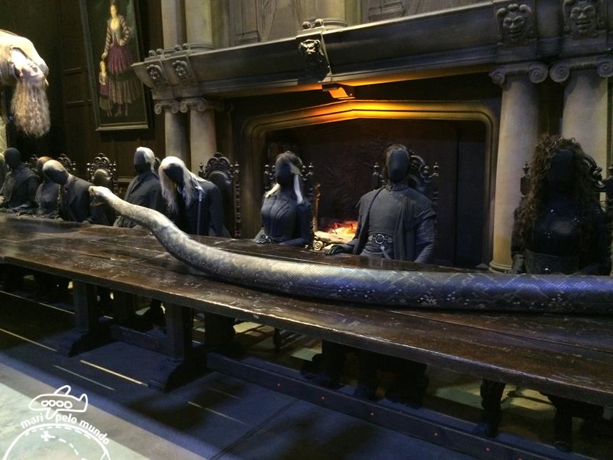 Uma cena do penúltimo filme de medo e morte. A cobra Naguini de Voldemort ataca uma bruxa na enorme mesa em que os seguidores do lorde das trevas se reúnem. No rosto dos seguidores o medo que sentem de seu mestre. O cenário está todo aqui, e a gente se sente vendo a cena do filme ao vivo!