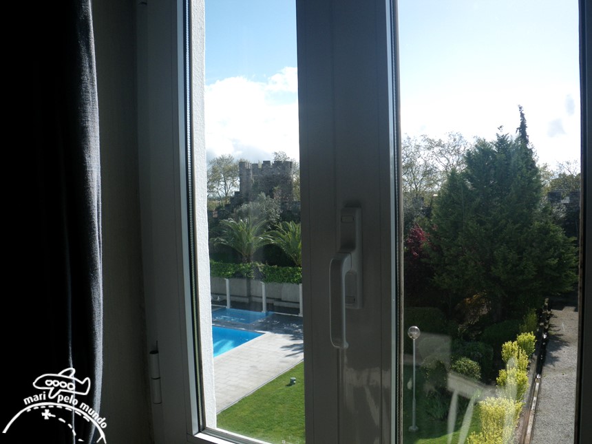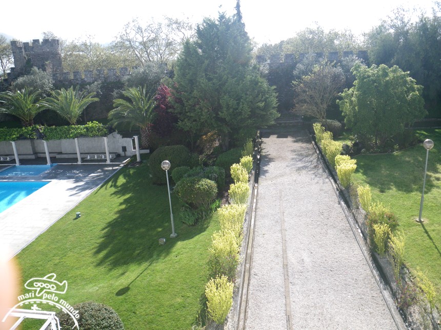 O clima não permitiu aproveitarmos a piscina, mas só de olhar para a grama verde e a água azul, já foi suficiente para alegrar os olhos. O M´AR de AR Muralhas é um hotel 4 estrelas e fica encostado a famosa muralha. Muito interessante. E fica bem próximo ao centro histórico, com uma curta e bela caminhada chega-se a Praça do Giraldo.