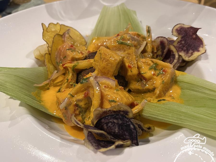 No jantar o destaque são pratos típicos da culinária peruana com toques de originalidade do chef. O ceviche “quente” é uma inovação onde o tradicional prato peruano é servido com sobre uma pedra quente com um molho delicioso.