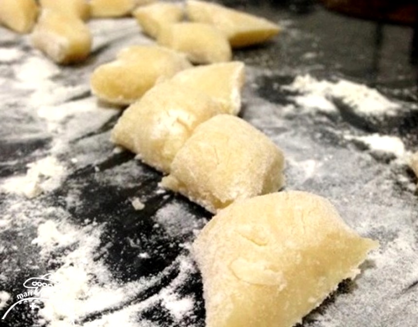 - Bata ligeiramente os ovos e misture ao purê de batata. Acrescente a farinha e amasse delicadamente até que fiquem tudo bem misturado. Divida a massa em porções de 1,5cm de diâmetro, sobre uma superfície enfarinhada.