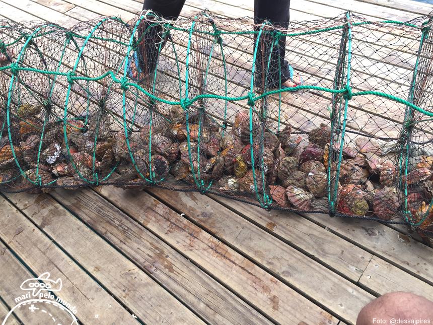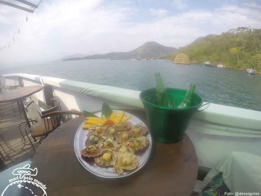 Claro que a pousada também aceita qualquer pessoa, é um lugar ótimo, muito simpático, tem um restaurante ali mesmo com uma comida caseira gostosa, um deck com mesas dentro do mar, e tem um passeio que a Patrícia que é a bióloga responsável pela cultura das vieiras apresenta mostrando como esse cultivo é feito. Depois disso, claro, voltamos ao restaurante para comer vieiras! Eu não gosto muito dessas coisas, mas só pela beleza do prato valeu!