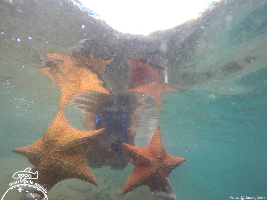 Tanto estava maravilhoso que eu resolvi bancar a nadadora de novo e me meti na corrente entre as ilhas (sim, eu fiz isso de novo) mas dessa vez o Rico (nosso guia) me salvou antes de eu passar sufoco novamente! Depois das Botinas passamos em uma praia que o nosso guia chamava de Praia do Amor, mas não é esse nome, ele chama assim porque ele brinca que são praias que só cabe uma lancha, então as pessoas vão ali para fazer amor, e foi em uma dessas praias que achamos as estrelas do mar gigantes, foi outra emoção!