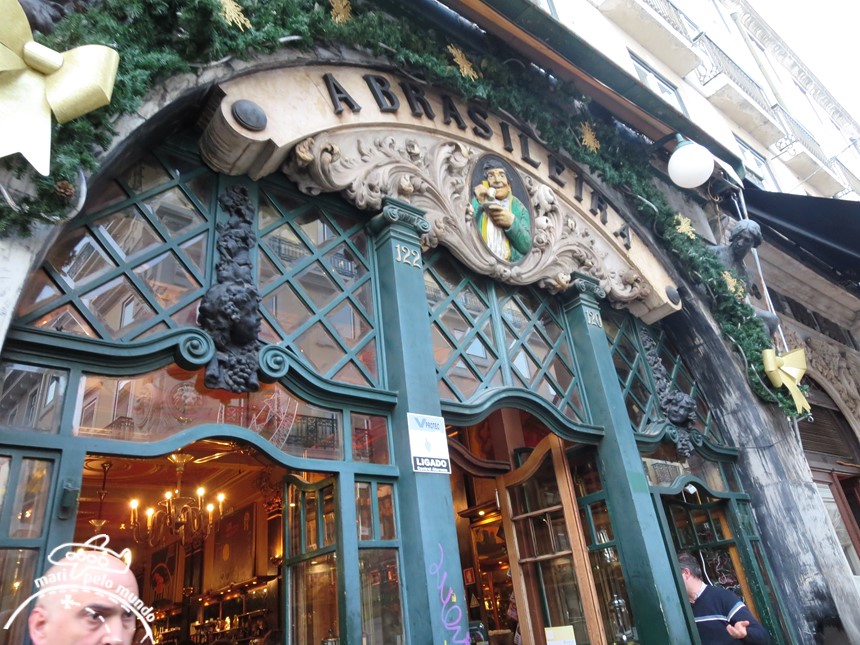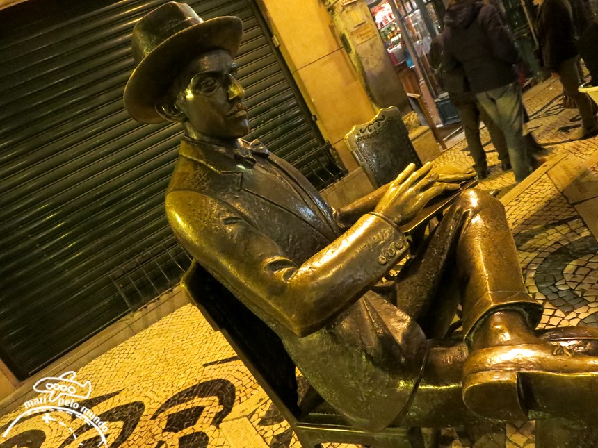 Não tem como errar o local porque logo na frente do café está a famosa estátua de Fernando Pessoa, que, dependendo do dia, há uma grande fila para tirar uma self sentado ao lado dele. A mão está brilhando, muitas pessoas o cumprimentam! : )