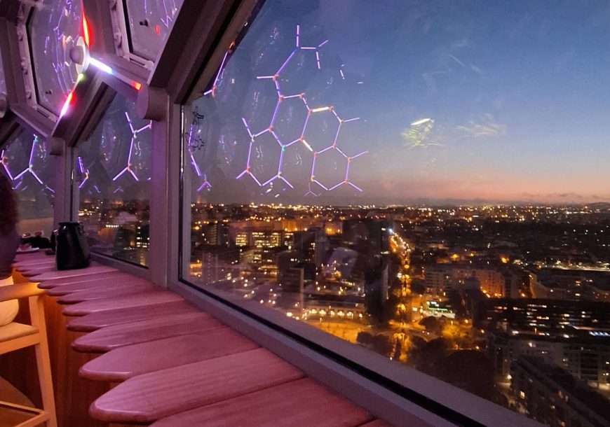O mirante segue até meia noite como um bar com musica e drinks alcoolicos e não alcoólicos. Optei pelo não alcoólico e estava ótimo! A vista no horário do por do sol é lindíssima. Recomendo ir as 18h ou 19h no verão e esperar o por do sol lá de cima. Depois desca para jantar no restaurante do próprio hotel ou um dos muitos que já no Parque das Nações.