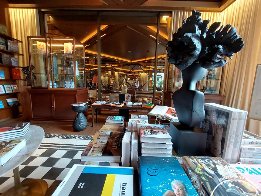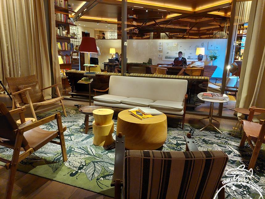 O lobby, dá acesso tanto ao restaurante, como ao espaço de eventos e aos quartos. Parece uma sala de estar e a gente se sente a vontade. As obras estão todas a venda e é um hotel internacional, com peças e obras de arte muito brasileiras e uma decoração clássica e moderna.