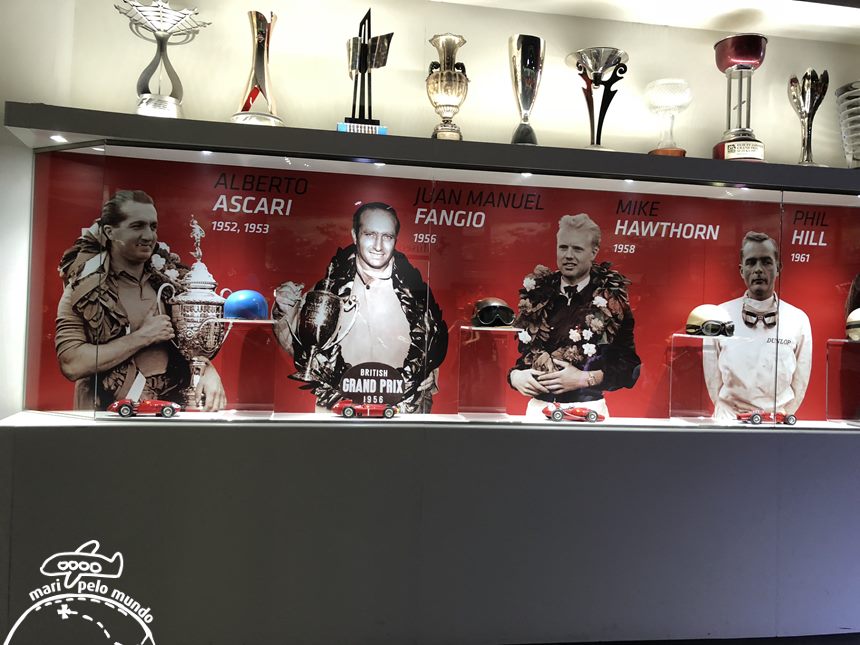 Na parede da sala os troféus da escuderia. E também seus maiores pilotos e ídolos de várias gerações. Entre eles Alberto Ascari, um dos primeiros pilotos da escuderia, e Juan Manuel Fangio, que fez história com 5 títulos mundiais, sendo 1 deles com a Ferrari. E claro não poderia faltar o maior campeão de todos. Michael Schumacher tem sete títulos na Fórmula 1, sendo 5 deles com uma Ferrari.
