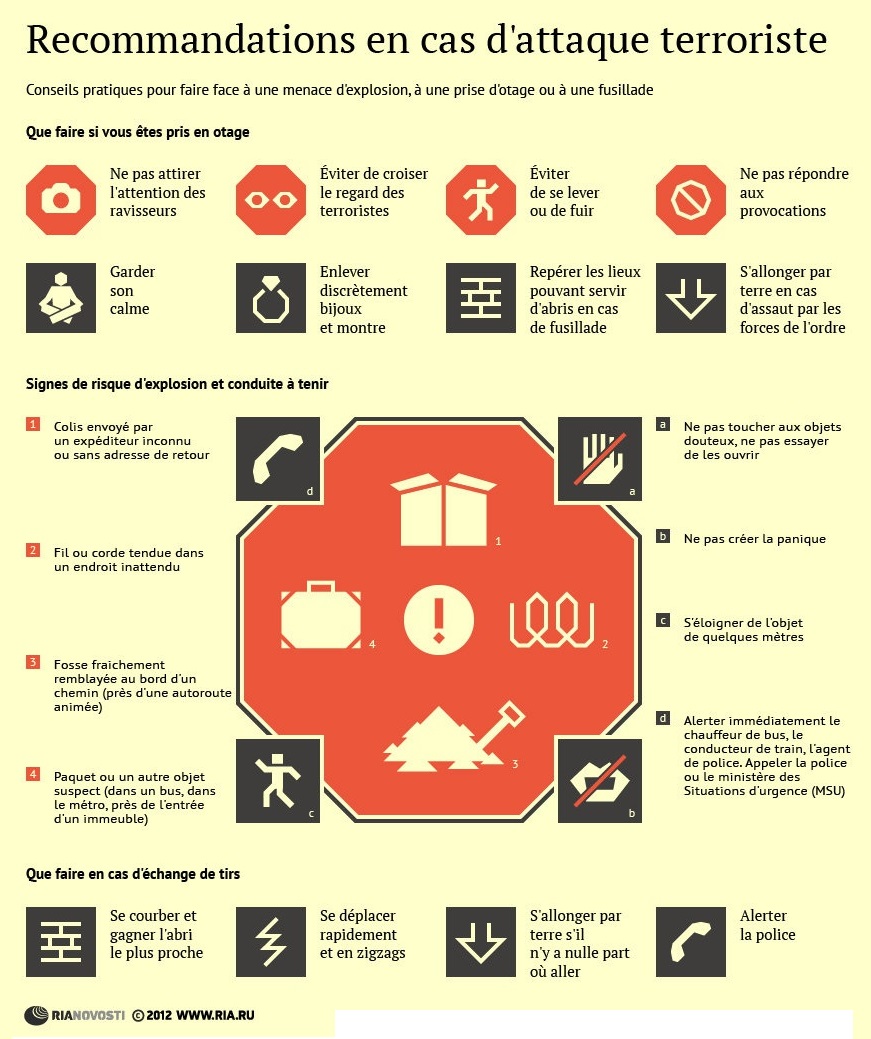 Em caso de ataque, o que fazer? Realmente não estamos preparados para nada semelhante a isso. E, mesmo que estivéssemos preparados, ainda assim, nada garantiria a nossa segurança. No entanto, encontramos este iconográfico muito explicativo, que compartilhamos com vocês. Faremos a tradução e acrescentamos mais alguns pontos: