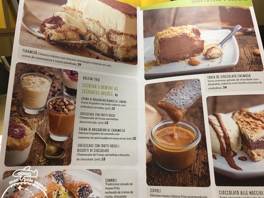 Para sobremesa uma boa dica é o “dolcini trio”. Escolha 3 doces entre creme de brigadeiro ao limão, cheesecake com frutas vermelhas, cheesecake com biscoito de chocolate e frutas vermelhas e creme de brigadeiro de caramelo!