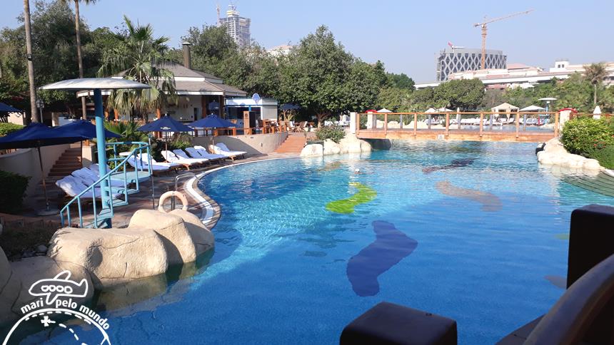 Nosso hotel em Dubai foi o Grand Hyatt Dubai. Como eu gostei, fica aqui a dica para quem quiser se hospedar em um hotel de luxo, próximo ao aeroporto, com estrutura de resort, cerca de 13 opções de restaurantes e não muito distante das principais atrações da cidade. Ficar perto da Avenida Sheikh Zayed. Há sempre taxi disponível na entrada do hotel, e o metro fica a cerca de 700 metros de distância. Clique aqui para reservar com a melhor tarifa ou aqui com hoteis.com
