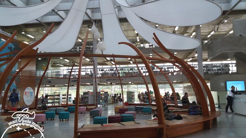 A biblioteca tem um espaço central lindo; sala de jogos eletrônicos; ludoteca; computadores com acesso à internet e bastante lugar para sentar.