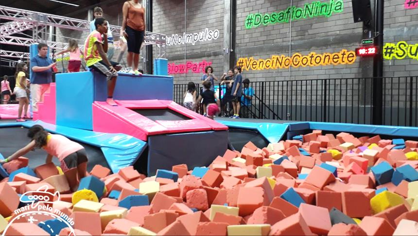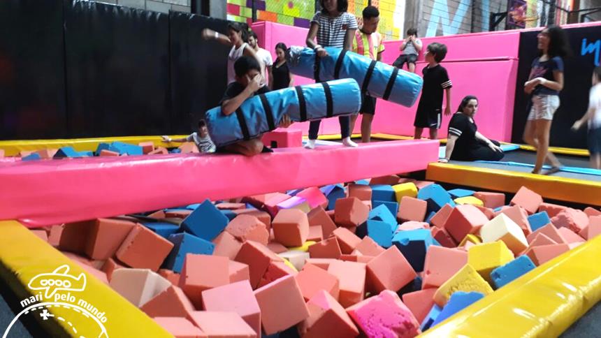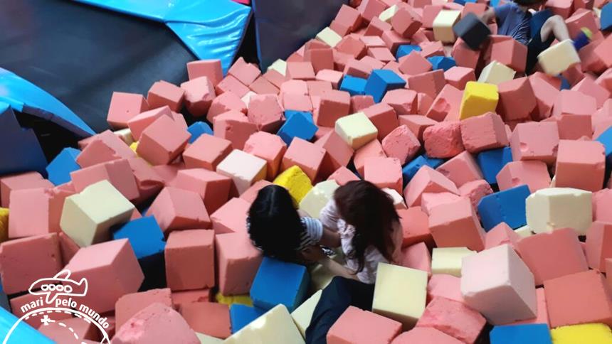 Uma parte legal do lugar é o trampolim com queda na piscina de quadrados de espuma. Haja fôlego para sair da piscina depois! Super divertido.