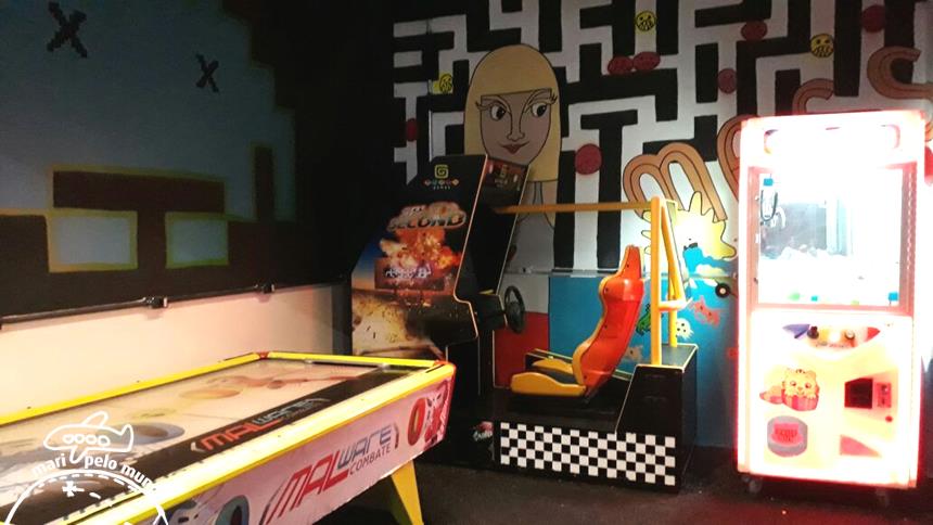 Ao fundo, há um espaço com outros tipos de distrações. Normalmente os pais ficam sentados na lateral, meio mal acomodados, olhando as crianças pularem, enquanto cuidam dos sapatos (há armário também para quem quiser alugar. Custa 1 real)
