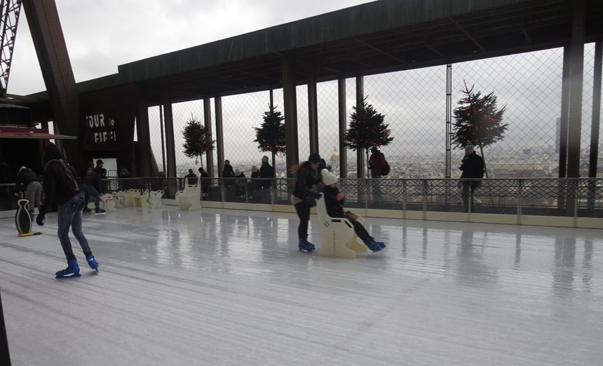 São várias pistas de patinação espalhadas pela cidade. A mais famosa é a instalada em frente ao Hotel de Ville (Prefeitura). Há também pistas menores nos principais Marches de Noel. Em 2015 a novidade foi a Pista de Patinação no primeiro andar da Torre Eiffel. Nós fomos testar. Paga-se para subir na torre, mas não para patinar. O vento e o frio são de enlouquecer, mas a pista e a vista que se tem lá de cima também, então valeu muito a pena.