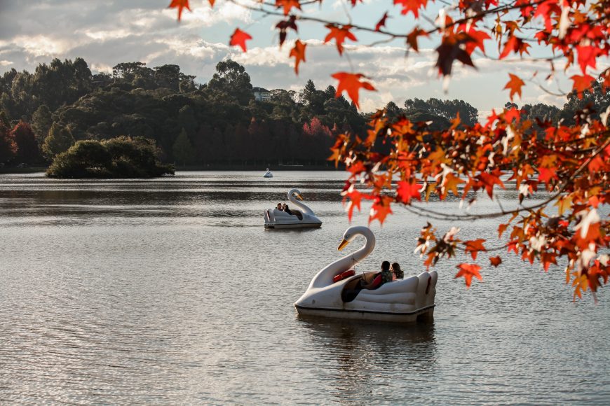 Na época do outono ganha o vermelho, laranja e amarelo das folhas das árvores de plátanos deixam o lago com um visual incrível.