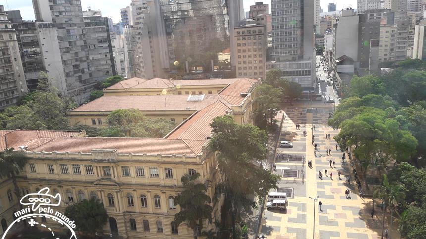 A varanda envidraçada tem vista para a praça da República, para as copas verdes das árvores. Uma vista linda que vale muitas fotos.