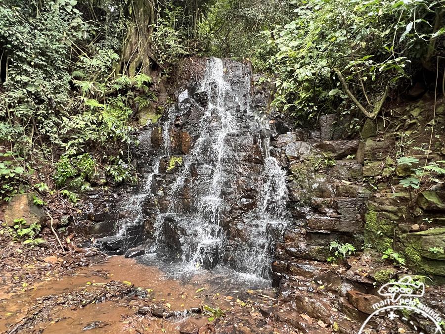 Fizemos as 3 trilhas das cachoeiras que são tranquilas para todas as idades. A primeira é a cachoeira Nascente com apenas 6 metros. Em um dia de sol e calor é ótima para brincar e se refrescar.