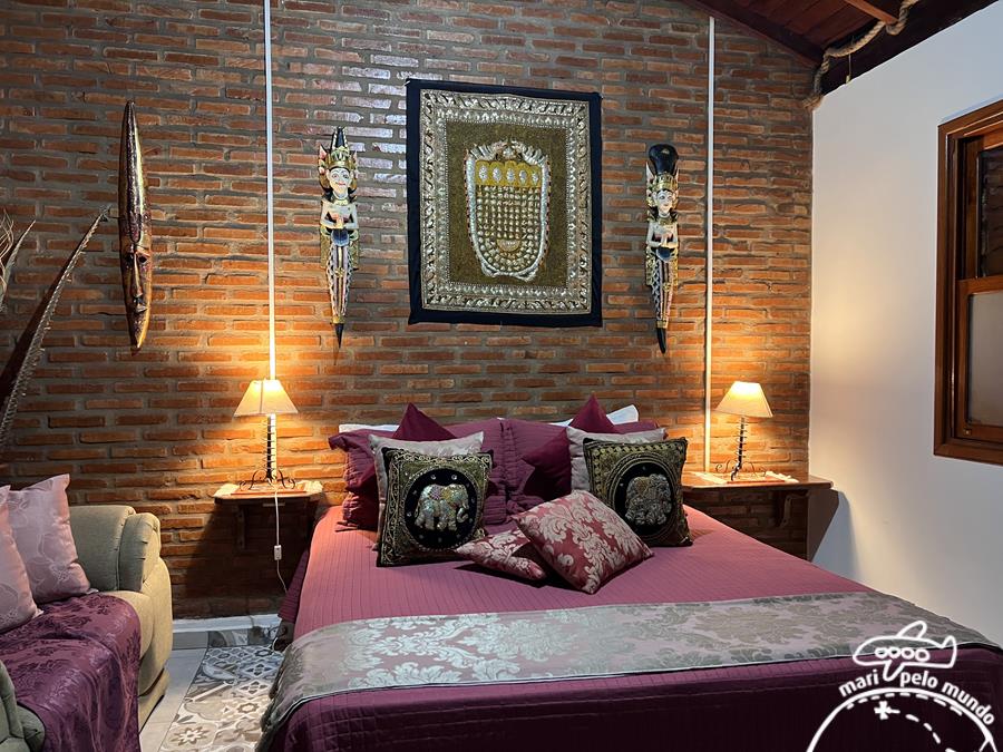 Os quartos temáticos são decorados com diversos detalhes, e todos tem banheira de hidromassagem ou ofurô. Estão todos localizado ao redor da piscina e do jardim, um dos cuidados especiais da proprietária, que aliás é uma simpatia!