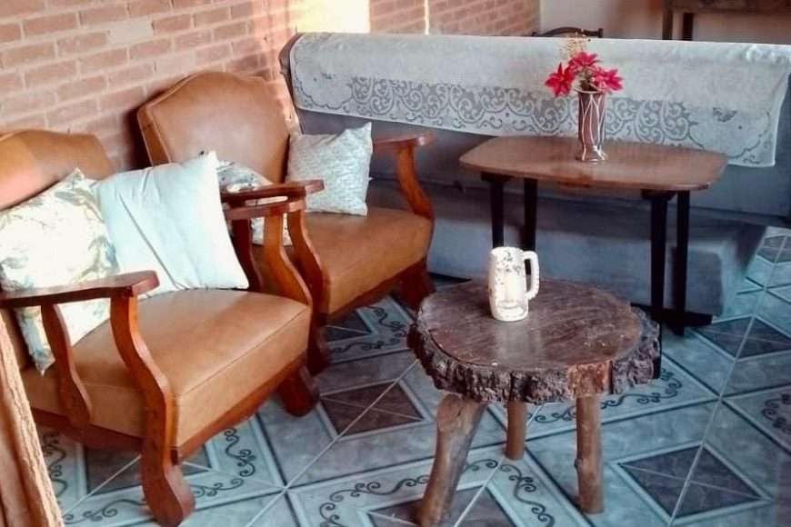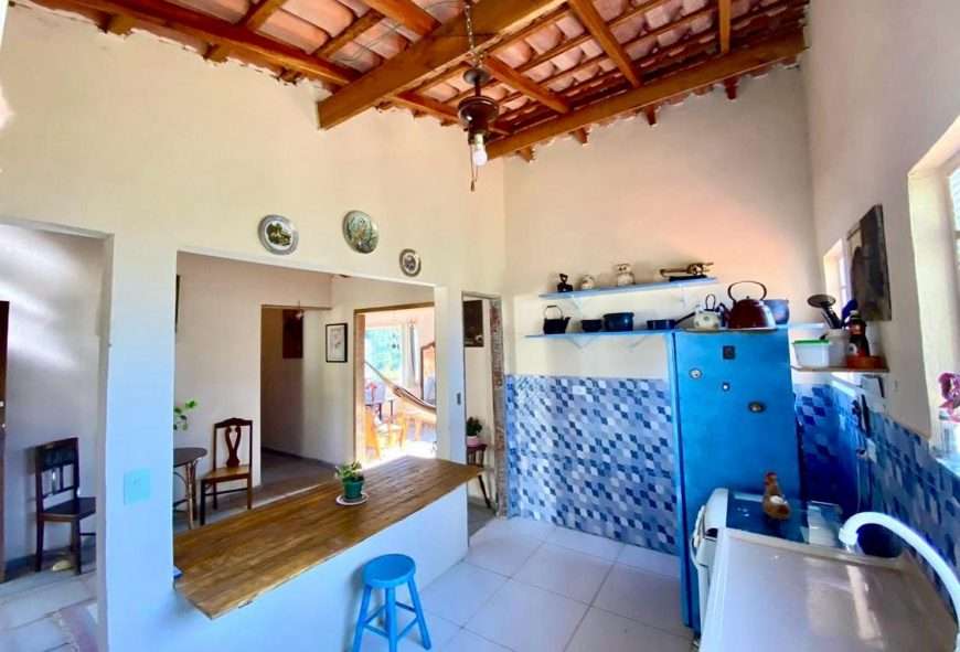 A casa tem decoração de fazenda, objetos que transportam a gente no tempo, além da comodidade de itens como cafeteira, ventilador, TV smart e wifi.