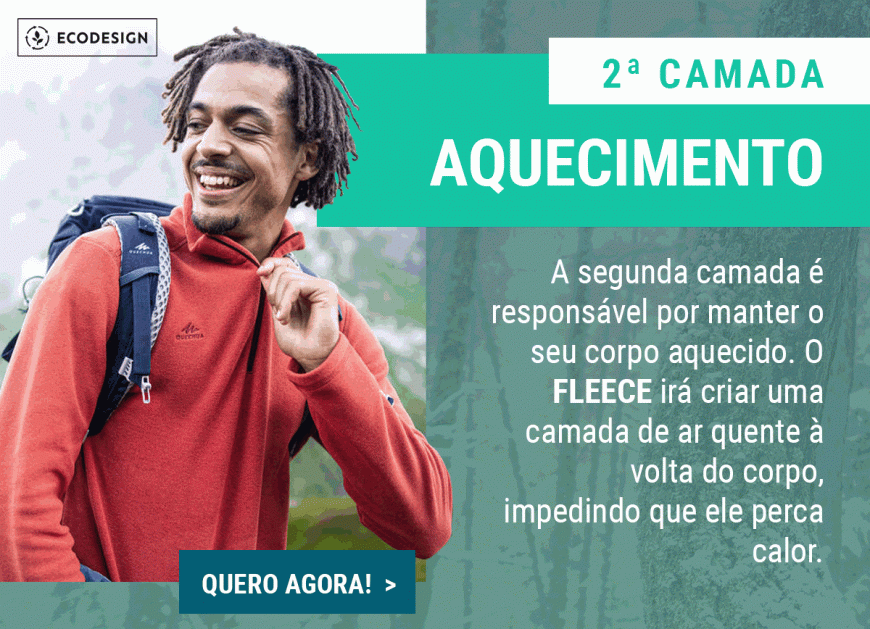 • Fleece – essa peça é indicada por ser feita de tecido sintético, parecido com uma flanela, mas que tem como características maior respirabilidade, é leve e compacta. Protegendo do frio sem pesar muito.