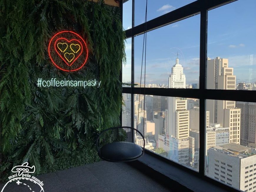 O lugar é um oásis para quem procura espaços instagramáveis. É uma das propostas do Sampa Sky. Obviamente começando pelos mirantes, mas também nas paredes que recriam o padrão das calçadas do centro de São Paulo, como o símbolo do estado. Ou então no balanço do café, e no letreiro do Sampa Sky.