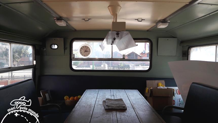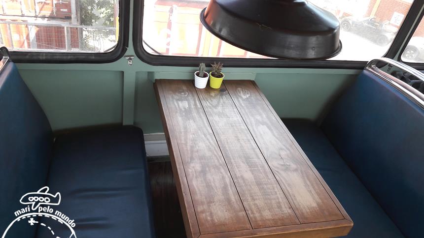 O espaço interno mantem os bancos de ônibus, acrescidos de mesas. Decoração vintage. Atendimento bom e a comida ótima.