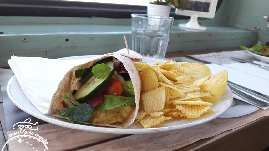 Há um menu infantil e menu vegetariano. Achei o preço justo. Experimentei o wrap (6,5 euros). E minha filha o menu infantil do dia (5,5 euros). Tofu com broa e alho – estava delicioso.