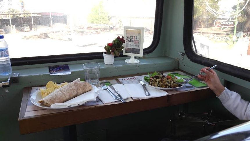 O restaurante, bar, lanchonete fica dentro de um ônibus e o ônibus fica em cima de um container. Então.. É um restaurante, ônibus, com vista… Ou seja, uma coisa super diferente.